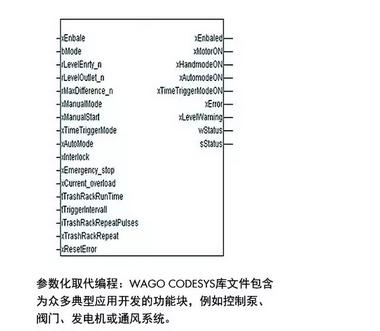 通过系统宏用户只需对相关应用进行配置,即编制数据点和系统参数便可直接调试系统,无需对传统系统进行全面编程,进而显著节省成本和调试时间;宏的重复利用对于其他应用来说也简化了标准解决方案。请记住这一点:WAGO随时愿为您提供最佳的服务,因为我们可根据客户特殊需求来定制解决方案(例如水泵功能块)。库文件总共包括约50个可用于水资源管理及过程控制领域的功能块。