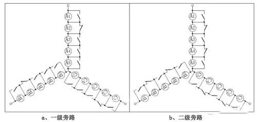 当某个功率单元故障时(如图2a所示),系统自动将该单元和另两相相对应的单元同时旁路,同时发出“一级单元旁路”轻故障报警,此时,不影响变频器正常运行,只是变频器的出力会降低8%。