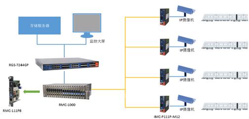 在控制中心放置一台RMC-1000机架式光电转换器,同时配合RMC-111PB光电转换器模组,连接现场端的IMC-P111P-M12,把光信号转换成电信号之后连接到核心交换机RGS-7244GP,视频存储服务器和显示大屏连接到核心交换机,对视频流进行存储和分析, 及时发现车辆安全隐患,确保人员和车辆的安全。