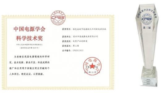 中国电源学会科学技术奖--优秀产品奖,授予电源行业中主要技术经济指标达到国际先进水平,在设计、工艺、材料、关键技术、系统集成等方面取得显著创新成果,推广应用取得较强市场竞争力,创造了较好的经济效益,形成了产业的主导技术和名牌产品,对产业技术进步有较大促进作用的优秀创新产品。