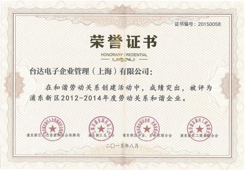 在曹路镇政府推荐下,台达获评“2012-2014年度浦东新区劳动关系和谐企业”,获得主办方的肯定。
