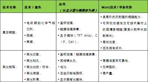 而近期热门的3D曲面手机也为移动设备开启了另一个可能性,并预期成为下一个市场关注焦点,Manz亚智科技以不断创新的技术,如真空镀膜、化学湿制程及激光技术,为3D曲面的面板制造商打造定制化且高效率的设备。此外,若Manz于制造商或品牌业者开发新技术和新产品时即参与研发,Manz的技术专长将可协助合作伙伴突破技术的瓶颈;同时提供定制化及高度整合的生产设备解决方案。因此,Manz亚智科技的价值在于协助制造商突破现有制程技术,挑战制程极限,如0.1mm/ 0.2mm超薄玻璃或3D玻璃的量产设备开发,进而使下一代产品能在最短的时间完成并推广到市场,让更多消费者能够以合理的价格享受惊艳的视觉与触摸体验。