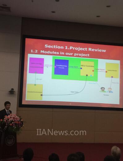 颁奖仪式后,实物组获得一等奖进行获奖发言与项目介绍。潘仁博同学作为项目组代表发言,介绍了该课题项目以及模型的工作原理,他们设计了一个列车通过外界环境的变化使车厢内照明系统自动调节的控制系统,使乘客感受更加舒适的车厢环境,并达到车厢内节能节电的环保目的。