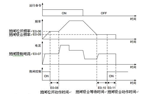 5. 适用于提升系统的抱闸控制,通过对驱动器内部输出电流和频率的精确控制避免绞车启动、停止时的溜车,同时还避免启动过流跳闸现象,控制图如下: