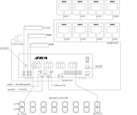 其他:如果 中央智能主机和作为音源的 DVD 不摆放在一起,DVD 和主机之间还需要布好音频线(最好有屏蔽,且距离不要超过 5 米)。 建议DVD和中央智能背景音乐主机摆在一起,红外控制器和主机之间不需要布线。