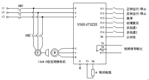 掰板起重机升降电机为13kW的8极变频电机,采用V560-4T0220重载矢量型变频器搭载起重专用扩张卡,制动电阻选配13kW、20Ω。