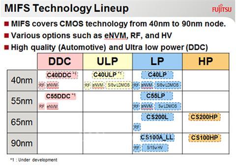 降低功耗并控制成本是IoT市场的关键,已成为半导体行业的最大课题之一,MIFS通过改善成本效率最为出色的平面CMOS工艺技术来解决这一问题。MIFS覆盖了从40-90nm节点的低功耗CMOS技术,提供eNVM、RF和HV多种选项,可支持汽车应用等高品质要求的,超级低功耗应用的DDC工艺新技术是由美国SuVolta, Inc.开发,而三重富士通半导体将制程工艺技术开发完成,并开始逐步量产,DDC具有在超低电压下可保持运作的晶体管与超低漏电晶体管技术。