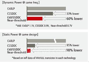 仓田创部长举例说道:“在相同的运行速度下,55nm DDC较传统55nm CMOS工艺降低了46%的总体功耗,较传统40nm工艺降低了18%。此外,超低漏电晶体管也将泄漏电流从皮安培(pA)降低到毫微微安培(fA)。”