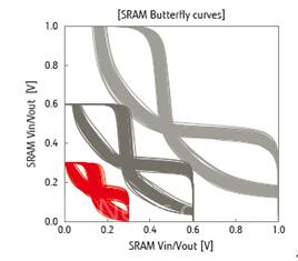2) 降低SRAM的Vddmin:如果降低Vdd的同时增加Vt的话,SRAM的电池操作一般会变得不稳定。DDC可以实现在Vdd极低的条件下运作SRAM。即便是在Vdd=0.3V的情况下,基于DDC的SRAM蝴蝶曲线依然展现出明显的两扇窗口的模样。