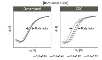 3) 强大基体因子(Body Factor)效应:DDC晶体管的body bias(Vbb)系数要强于传统的晶体管。因此,DDC可以实现Vt的灵活控制。