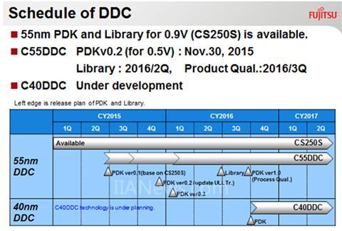 下图是三重富士通的DDC工艺发展路线图,2015年11月底该公司已开始提供PDK的“C55DDC”还可为客户量身打造提供低功耗方案,包括提供灵活的工艺优化、参数调整等服务。并且,如果客户的产品已经在别的foundry运行过,也可以到三重富士通的工厂生产,其技术人员会帮助调整参数,减少客户开发难度。