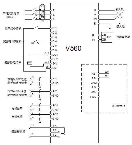 引风机和鼓风机控制着锅炉炉膛内的压力,引风量随着鼓风量的变化作相应的调整,使锅炉内部始终保持一定负压值,确保整个燃烧系统的稳定性。引风机采用1台V560-4T6300G变频器驱动,鼓风机采用1台V560-4T1850G变频器驱动。控制方式采用本柜(手动控制)/DCS(自动控制)控制,变频器通过DI端子选择频率源,手动调节频率采用本柜电位器给定0~10V信号(模拟输入AI1-GND)控制电机转速,自动控制频率采用DCS给定4~20mA信号(模拟输入AI2-GND)控制电机转速,起/停由本柜端子控制,同时具有起/停、故障报警状态指示,急停装置;电机转速值和电流值分别以4~20mA信号(模拟输AO1-GND、AO2-GND)输出反馈给DCS控制器作为运行状态监控。以引风机为例,V560系列变频器的控制线路如下图2所示: