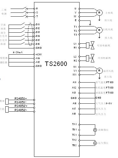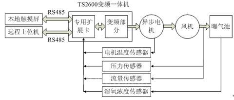 针对污水处理中曝气风机的工艺要求,采用TS2600系列变频一体机,搭配专门为曝气风机研发的扩展卡,使用触摸屏作为人机界面,设计了如下的应用方案: