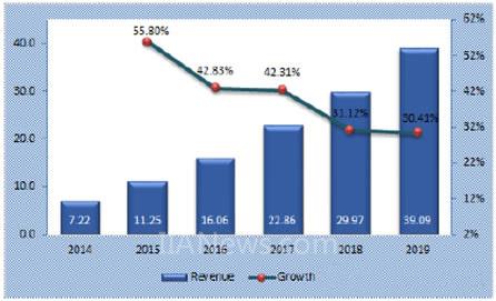 2014年全球工业互联网系统集成服务市场约72.2亿美元,预计到2019年将达390.9亿美元,增长率为40.19%。