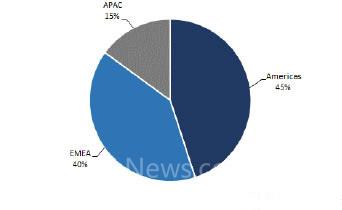 从地理分布来看, 2014年,美国工业互联网服务市场占全球的45%,欧洲、中东和非洲占40%,亚太地区占15%。