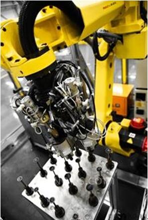 M-20iA 机器人配合iRVision视觉系统可智能定位缸盖上气门孔位置,通过FANUC FS-40iA力觉传感器,机器人可将气门杆头部准确的插入到缸盖气门杆孔中,从而实现气门杆高精度智能装配。