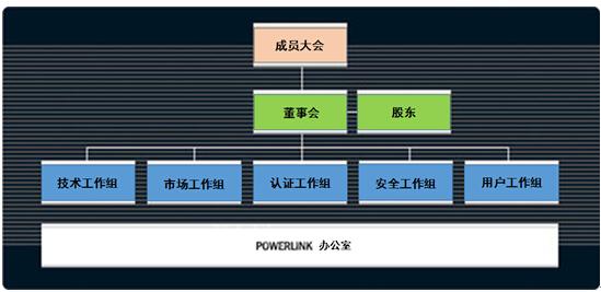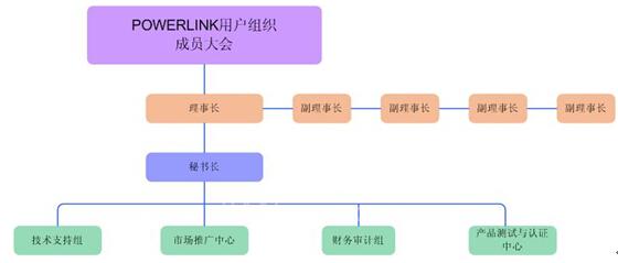POWERLINK中国用户组织的组织架构为理事会结构,由成员大会、理事会、秘书长与各工作组构成,所有成员为该组织的最高权力机构,理事会向成员大会负责,理事会成员由理事长和副理事长构成,秘书长由理事长任命并领导日常各工作组的工作开展,向理事会负责。