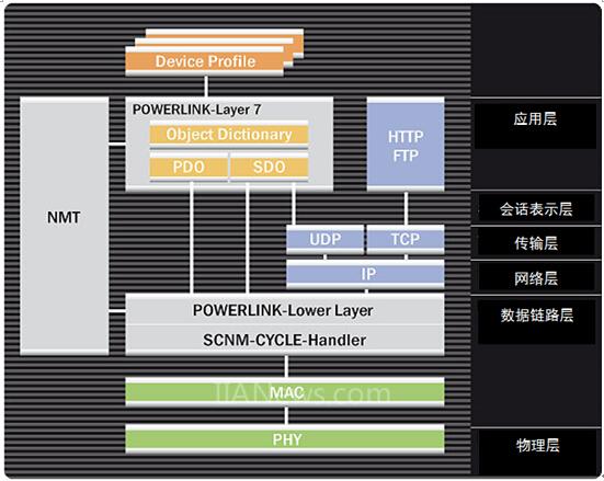 第一层是物理层,或者说是比特传输层,定义了传输介质的电气、机械和功能接口,上面的数据链路层通过偏差发现机制确保了终端设备和传输介质正确的数据地址和可用的连接。为了简化的原因,这两层在联网技术中称为“物理层”,上面是第三和第四层,第三层“网络层”,控制数据传输的时钟和逻辑,第四层“传输层”,单元数据分配到应用层,第五层、第六层和第七层称为应用层,由于所有的程序和应用直接到他们。如我们已经说明的,以太网只是覆盖了物理和数据链路层,之后,这使得不同的协议和访问不同的层,比如前面所说的POWERLINK和CANopen,POWERLINK是物理层,定义了最低层,CANopen是应用层,定义了最高层。