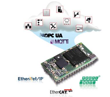netIOT嵌入式模块netIC模块基于netX 52多协议芯片,产品依然通过SPI或者Modbus串行方式与用户设备连接,为用户拓展工业以太网网络通讯接口,同时用户能够在同一根物理线缆上通过OPC UA或MQTT方式与实时以太网通讯并行地将数据传输到云服务器,供大数据分析,而不会影响PLC数据通讯。实现符合工业4.0要求的现场智能云设备。