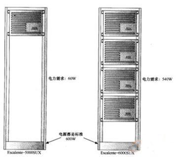 以图所示的服务器为例,两个服务器来自同一个系列WasteTech'sEscalenteline。左边的WasteTech'sEscalente5000SUX配置了足够的硬件,只需要60W的电能。右边的6000SUX的最高配置安装上足够多的硬件后则要消耗540W的电能。然而两台服务器却使用了同样的电源。尽管目前的电源使6000SUX获得了足够的电能,但是对于消耗电量较少的服务器而言,则提供了过多的电能。这种过度供电造成了浪费。