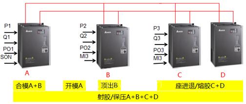 (注:A、B、C、D分别代表台达油电伺服驱动器VFD-VJ系列与相应的马达、油泵构成的工作站,P1、P2、P3为上位控制器下达的压力命令,Q1、Q2、Q3为上位控制器下达的流量命令,PO1、PO2、PO3分别为压力反馈,SON为使能信号,MI3为分流信号。)