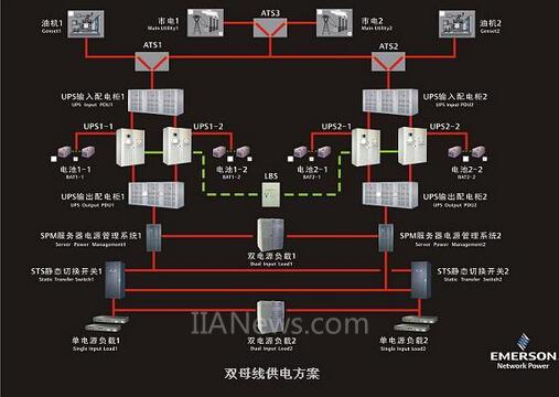 在UPS输出到服务器等IT设备输入间,选用SPM(服务器电源管理器)进行电源分配和供电管理,实现对每台机柜用电监控管理,提高供电系统的可靠性和易管理性。对于双路电源的服务器等IT设备,可以通过SPM直接从双母线供电系统的两套母线引人电源,即可保证其用电高可靠性。对于单路电源的服务器等IT设备,通常选用STS(静态切换开关)为其选择切换一套供电母线供电。在供电母线无法正常供电时,STS将自动快速切换到另一套供电正常的母线供电,确保服务器等IT设备的可靠用电。