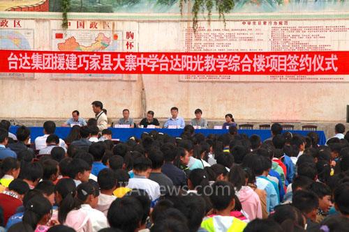 图1 在师生见证下,台达集团宣布将捐款援建云南鲁甸地震灾区大寨中学教学综合楼