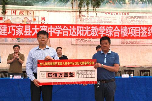 “云南鲁甸地震”后,台达集团承诺捐赠人民币500万元协助灾区重建工作。经鲁甸巧家县教育局对教育建设进行规划并立项,台达决定将捐款用于支持巧家县“大寨中学”教学综合楼的建设。基于过去援助灾后重建的经验,台达将结合中国建筑设计研究院的专业设计能力,为大寨中学打造一栋舒适、安全且充满绿色建筑巧思的教学楼,让在校师生体验绿色建筑带来的好处,并进一步传播环保节能的理念。援建项目签约仪式今(12)日于巧家县举行,台达集团-中达电通副董事长尹镟博、巧家县民政局副局长刘昆、巧家县教育局副局长马发升、巧家县委统战部常务副部长冉渡江代表签署援建协议。