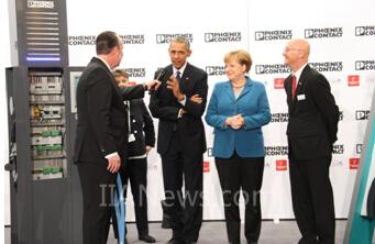 4月25日,德国汉诺威,美国总统奥巴马在德国总理默克尔的陪同下,出席汉诺威工业博览会,并专程参观了位于9号展馆的菲尼克斯电气展台,特别了解了菲尼克斯电气的电动汽车快速充电技术。该快速充电系统符合欧洲和美国标准,大大满足了用户对快速充电的高要求,引起了奥巴马的极大兴趣。奥巴马总统饶有兴趣地询问:“不同汽车制造商生产的汽车是否可以共用插头?”菲尼克斯电气集团首席执行官Frank Stührenberg先生解释道电动汽车插头外观在不同的国家和地区有所区别,但在欧洲和北美地区采用相同的通讯标准,并介绍了首款快充功率可达350千瓦的电动汽车插头,该插头可在15分钟内将一般的电动汽车电池充满。