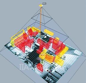 Zimmer集团的工厂基本运行两种防护区。黄色区域是警告区域:进入该类区域不会自动形成对操作人员的危险。但是黄色警告灯会亮起,声音信号会响起。安全限制速度启动部件以安全速度运行,以此作为预防措施。如果工人意识到自己误入该区域,然后再次离开虚拟警告区域,工厂则按正常速度继续运行。但是,如果工人进入邻近的红色区域,工厂则会安全关闭:红灯会亮起,警告信号会响起。若要恢复生产模式,操作人员必须确认身份,以便工厂可以重新启动。