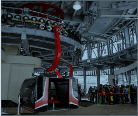 在奥地利蒂罗尔州伊始格尔,人们采用所谓的三线可拆卸式缆车攀登Pardatschgrat山。这种三线类型的系统拥有两个固定轨道,供车厢运行,还有一条循环牵引绳。伊始格尔的索道需攀登1251米,在顺利投产后打破了三线索道的世界纪录。全程不到10分钟就可以完成,最大额定速度为7.5米/秒。显然,站内的移动速度比离站及登顶的安全速度要低得多。当车厢到达车站后会从牵引绳上卸下,然后通过轮胎输送机平稳减速。在乘客平台,他们以步行速度缓慢移动。在站内,车厢通过车轮而非轨道绳索在轨道上运行。当卸下牵引绳后,车厢的摩擦模块会与轮胎输送机接触,以确保电力传输。此处安装了多个诺德减速电机,并通过传送带来驱动每个轴。该缆车由缆车工程与制造的全球领导者多贝玛亚/格拉文达集团的子公司多贝玛亚公司制造而成,该集团在全球89个国家已完成超过14600个项目。多贝玛亚自2005年以来就与诺德位于林茨的奥地利子公司Getriebebau NORD GmbH合作。多贝玛亚公司负责可拆卸缆车索道的Johannes Moritzhuber说:»与诺德合作,我们总能获得符合任意安装类型的驱动系统。我们之所以选择诺德的驱动系统,因为它能满足我们对最大的可用性,卓越的安全性和优异的可维护性的要求。诺德在选件功能方面非常灵活。这些驱动系统非常可靠,运行安静,诺德还能确保整个备件在全球快速交货。