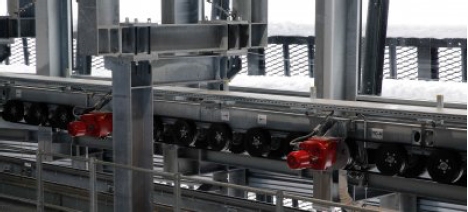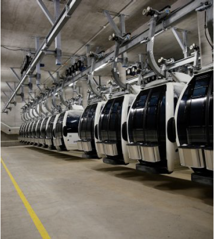 多贝玛亚和诺德传动集团就福拉尔贝格邻近的Grasjochbahn单线循环索道展开了合作。在夜晚,该项目及Tyrol项目中的所有车厢都存放在车库里。这一停放方式延长了设备的使用寿命,也是多贝玛亚公司的首创。最初,这项工作需要投入大量人力,但现在大部分已实现自动化。这两条索道包括位于山谷车站下的多轨车库。在Grasjochbahn项目中,车厢通过坡道输送到车库地板中,并通过轮胎运输机平稳地传送到输送机链上。在车站和车库之间运行的轨道可承受一定重量。在伊始格尔车库中,该设施更节省空间:诺德电机用于驱动垂直输送机,进而带动车厢行驶。轮胎输送机用于实现水平输送。这些电机配有温度传感器和编码器,并采用中央控制。