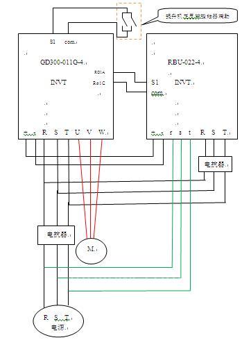 广州某电路器材公司是南方电网的下属公司,主要生产跟电网有关的设备,电线杆,电线塔等等产品,共有60多台行车需要进行节能改造,由于以前试用过其它公司的节能产品效果不理想,经过各方了解英威腾在节能改造方面有一定技术优势,决定先安装一台行车试用,如果效果达到要求,再大面积推广。客户要求节电率达到20%以上,运行平稳可靠·,不影响生产,经过协商决定选择一台7.5KW提升机作为样机改造运行一段时间看效果,我们选择的变频器是一台英威腾GD300-011G—4,能量回馈为一台RBU-022-4,和一些配件,接线示意图如图2:
