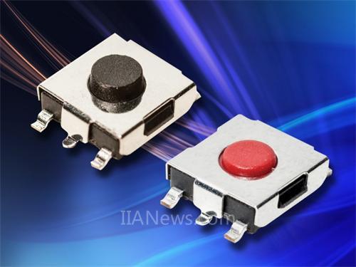 PTS641 系列开关属于符合RoHS指令要求的SPST(单刀单掷)顶部起动瞬间作用开关,其额定操纵力和行程距离选项使用彩色编码:蓝色致动器具有160gf +/-50gf 的操纵力和0.20mm +/-0.15mm 的行程距离、红色致动器具有250gf +/-50gf 的操纵力和0.20mm +/-0.15mm的行程距离、黑色致动器具有320gf +/-80gf 的操纵力和0.30mm+/- 0.15mm 的行程距离。触点的额定电流和电压分别为50mA(最大值)和12VDC(最大值),回跳时间低于5ms,工作温度范围为-20°C至70°C。