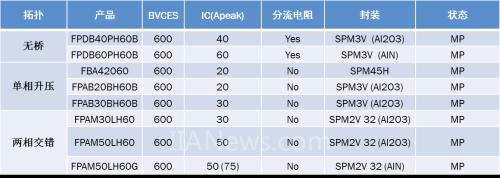 SPM3系列主要应用于高功率空调、工业变频器、工业泵和工业风扇等,这些模块集成了内置 IGBT 已优化的门极驱动,使用 Al2O3陶瓷基板实现极低热阻,从而优化EMI性能和最小化损耗,同时提供欠压锁定、过流关断和故障报告等多种保护特性。内置高速 HVIC 仅需要单电源电压并将收到的逻辑电平门极输入信号转换为高电压、高电流驱动信号,从而有效驱动模块的内部 IGBT。其中1200 V系列主要针对要求小型化的3相变频器应用,目前已量产的如FSBB10CH120D,额定输出为10 A,后续将推出额定输出为15 A、20 A的型号。而600 V系列则涵盖更宽广的功率范围,目前可从15 A至30 A,如FSBB15CH60D(15 A)、FSBB20CH60D(20 A)、FNB33060T(30 A),同样封装的IPM已经扩展达到50 A。