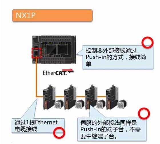 NX1P和1S伺服配套使用、通过1根EtherNet电缆即可轻松配线,并且1S伺服的I/F本身就是端子台、不需要中継端子台。