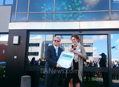 图二:荷兰绿建筑委员会总经理Annemarie van Doorn (右)将BREEAM绿建筑认证颁发给台达EMEA区总经理张财星
