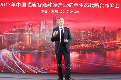 2017年4月28日,山城重庆,“大合作,全网通,共精彩!”中国联通智能终端产业链全生态战略合作峰会盛大举行。Qualcomm执行董事长保罗·雅各布博士(Dr. Paul Jacobs)出席峰会并发表题为 让未来更快到来》的演讲。