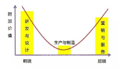 微笑曲线将一条产业链分为三个区间,即研发与设计、生产与制造、营销与服务,其中生产制造环节总是处在产业链上的低利润环节。