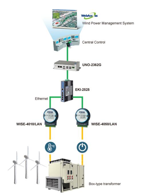 通过嵌入式无风扇工业电脑UNO-2362G、非网管型工业以太网交换机EKI-2525以及两款物联网以太网I/O模块WISE-4010/LAN与WISE-4050/LAN,研华解决方案即能将现场各种装置的信号与数据上传至中心监控室内的风场监控系统。其中,可支持Windows CE、Windows XPE、Embedded Linux等多种开放式操作系统的UNO-2362G能以更好的兼容性来取代原有的RTU;而提供高速以太网络传输的EKI-2525所形成的局域网络(LAN)则负责串连现场所有的硬件装置,并藉此让风力发电机成为可被监控的联网设备。