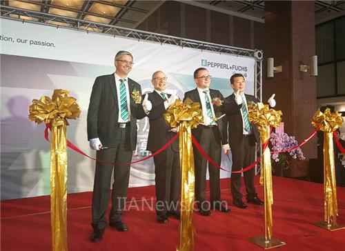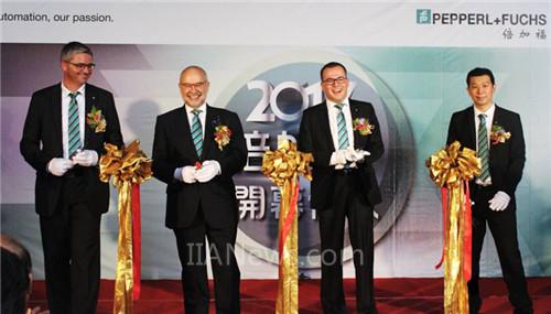 倍加福总部工厂自动化部门总裁Reiner Mueller先生(左一),倍加福亚太区工厂自动化销售总裁Matthias Gunkel先生(左二),台湾倍加福有限公司总经理Daniel Winkler先生(右二),台湾倍加福有限公司业务经理杨智凯先生(右)参加开幕剪彩仪式