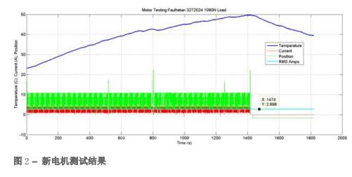 图 2 显示了所选电机的测试结果,该电机具有可兼容外形尺寸,以及通过更低绕组电阻获得的更高扭矩和热性能。