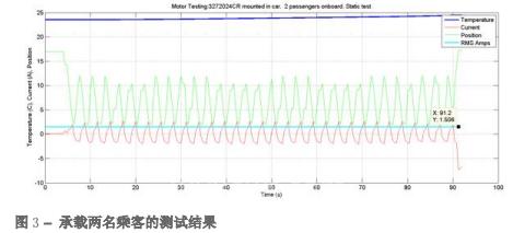 上路测试 替代电机并不是库存电机的直接替换件,因为它需要钻 3 个新孔。必须订购新的小齿轮并进行加工,以适应新电机的电机轴。改装后的执行器被安装在车辆的一角,以便通过测试循环和控制器来测试静态转向性能。团队分别在空载、承载一名乘客和两名乘客的情况下对车辆进行了测试。如下图所示,承载两名乘客时执行器电流为 1.5A RMS,这大致对应于 600N 的执行器输出力,并且可在该电机 100%占空比下保持。
