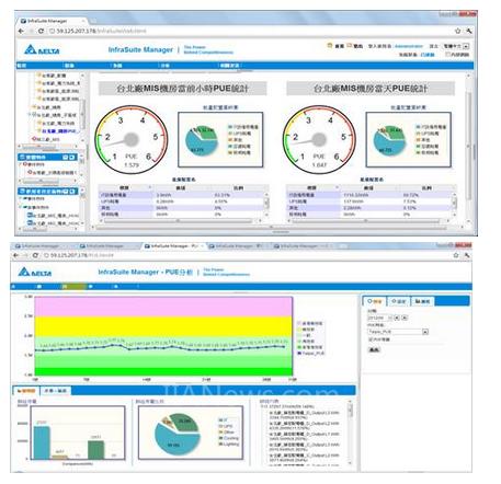 在台湾地区空调耗电量又包含送风机与冰水能耗,而大部分建筑又是共享冰水主机,这一点经常造成许多数据中心无法准确的计算PUE数据。台达的整合式的环控系统因应此需求可以生成一个虚拟电表,依照冰水流量与进出水管的温差,计算出机房的冰水热量转换为kWh,再除上冰水主机的COP,就可以得到较准确的冰水主机耗电量。