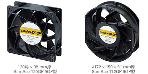 山洋电气株式会社研发并发售了※1可承受高离心加速的抗加速度风扇,120角 × 38 mm厚 ”San Ace 120GP” 9GP型,Ø172 × 150 × 51 mm厚 ”San Ace 172GP” 9GP型。