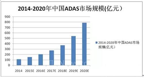 根据美国市场调查机构策略分析公司(IMS)数据显示,汽车电装配件市场预计将从2015年的2390亿美元飞速增长到2020年的3033亿美元。而在中国,鉴于中国新车评价规程(C-NCAP)将于2018年加入关于AEB等功能的检测,国内ADAS市场也将迎来前所未有的增长。因此,IMS对中国ADAS市场规模的预测也十分乐观,预计到2020年中国ADAS市场规模将从2014年的100亿元左右增长到接近800亿元,年均增速在30%-40%。