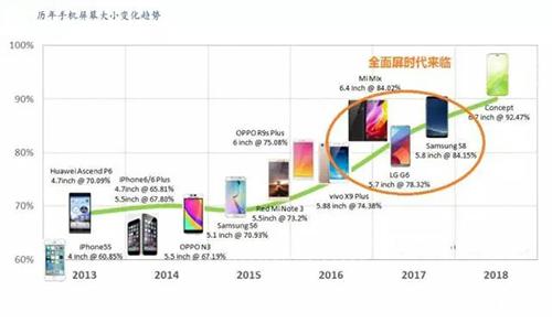根据相关市场研究机构公布的数据,2017年全面屏产品在智能手机市场的渗透率仅为6%,但随着越来越多上游面板厂的介入,这一数字将会上升到50%,而到2021年,几乎所有的产品都会采用全面屏。