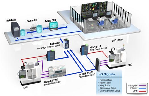 中国某工厂一直在寻找一个解决方案,可以提供所有CNC的状态监测信息,以避免不必要的现场维护,而是将资源都集中在系统关键环节。NPort 5110串口设备联网服务器将每台CNC连接至由EDS-408A非网管工业以太网交换机组建的工厂骨干以太网中,因此技术人员无需为每台CNC手动安装新的生产计划。然而,技术人员仍然不得不定期安排现场巡查,以确保CNC的正常运行。每台CNC有三种不同颜色的指示灯,用于监控设备的状态,将具体的维修任务传递给技术人员。红灯表明该系统处于离线或关闭状态,绿灯表示机器空转,黄灯表明该系统正在运行。管理人员意识到,他们通过采用Moxa ioLogik以太网远程I/O连接每台CNC,将CNC处于空闲或离线的状态信息通知给直接数控(DNC)服务器,这样可以节约大量的时间和金钱。