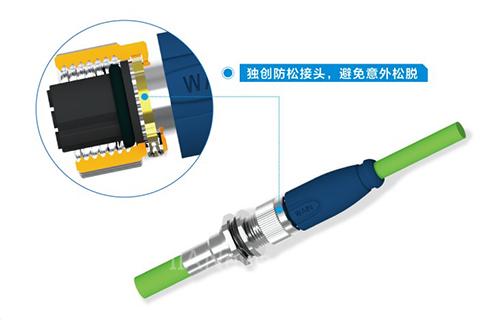 M12-D-Code防转新结构连接器与CAT5和CAT5e模块插座(RJ45)的传输技术条件相应, M12-D-Code螺帽防转新结构的防护等级IP67,可以适用于石油、钢铁、电力、汽车制造等较为恶劣的环境应用。