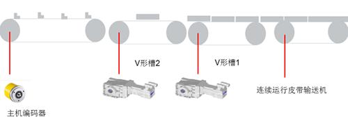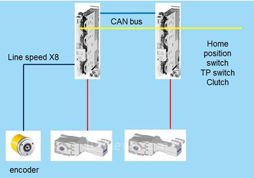 解决方案采用2台Lenze的9400伺服控制器作为运动控制的核心,用于V形槽1、V形槽2部分的运动控制。此方案可使两个轴完全同步于编码器,实轴的位置信号通过CAN总线传到V形槽2。对于周期性工作模式,Lenze伺服具有余数补偿机制,可有效避免累积误差的产生。拓扑结构参见下图。